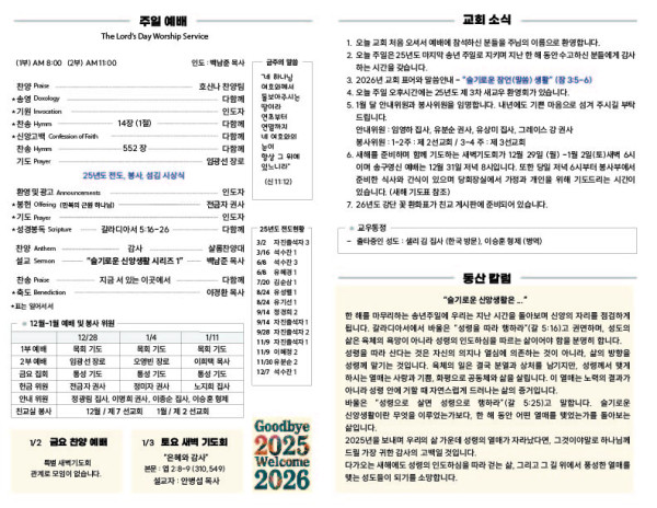 12/28/25 교회 주보 페이지 정보 작성자 아름다운동산교회 댓글 0건 조회 36회 작성일 25-12-27 07:47 목록 본문 12/28/25 다음글12/21/25 교회 주보 25.12.20 댓글 0 댓글목록 등록된 댓글이 없습니다. 목록